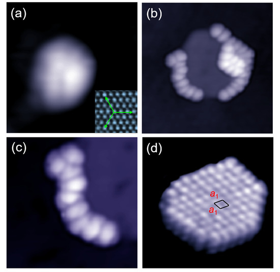 - Stasevich, T.J.; Tao, C.; Cullen, W.G.; Williams, E.D.; Einstein, T.L. Impurity Decoration for Crystal Shape Control: C60 on Ag(111). Phys. Rev. Lett. 2009, 102, 085501. [Google Scholar] [CrossRef]