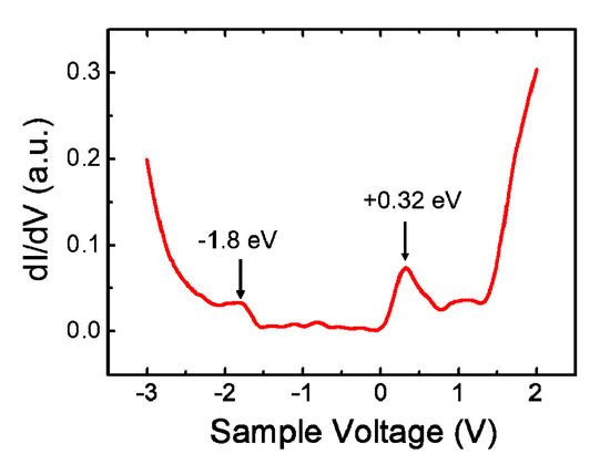 Figure 5 shows a scanning tunneling spectra (STS) acquired on top of a C60 molecule at 77 K in the (2√3 × 2√3) R30° domain. The measured highest occupied molecular orbital (HOMO) is located at −1.8 eV, while the lowest unoccupied molecular orbital (LUMO) appears at 0.32 eV. Thus the HOMO–LUMO gap is 2.12 eV, which is much smaller than that (4.9 eV) of a free C60 molecule in gas state, but comparable to that (2.7 eV) of C60 on Au (111) and (2.3 eV) of C60 on Ag (100) [5,13]. Compared with the LUMOs of C60 on noble metal surfaces [0.84 eV for Au (111), 0.49 eV for Ag (100), and 0.43 eV for Cu (100)], the lower position of C60 LUMO (0.32 eV) on Cd (0001) reflect the stronger reactivity of Cd substrate [4,5,13]. Moreover, the effect of substrate screening may also reduce the HOMO–LUMO gap, through reducing the intramolecular Coulomb repulsion [50]. In addition to the peaks corresponding to HOMO and LUMO, there are also small peaks appeared in the gap, which result from the surface states or quantum well state in the Cd (0001) films [45].