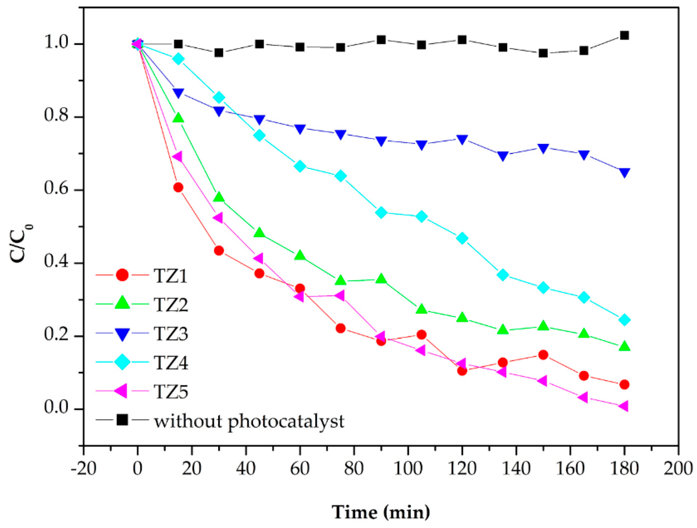 3.3. Photocatalytic Properties of Complex Oxide Nanofibers with Different Ti and Zn Ratios