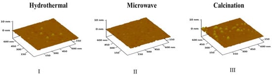 Atomic force microscopy (AFM) images for (I) hydrothermal-carbon dots (CDs), (II) microwave-CDs, and (III) calcination-CDs.