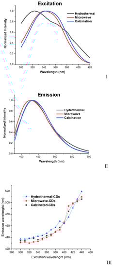 (I) Excitation- and (II) emission-spectra in aqueous solution from hydrothermal-, microwave-, and calcinated-CDs at 320, 340, and 330 nm excitation wavelength, respectively, and (III) emission wavelength (nm) as a function of the excitation wavelength (nm).