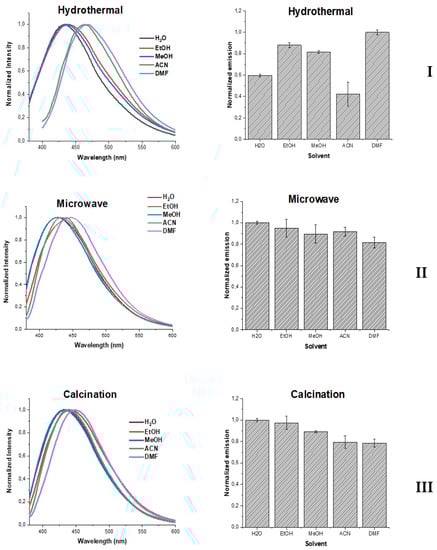 Despite extensive research, the origin of photoluminescence of CDs is still a matter of debate. A particular focus of research in recent years is to determine the role and relevance of core and surface states to the emission of these nanomaterials [59,60,61]. Therefore, we have also analyzed the effect exerted by the external environment to the fluorescence of the three studied CDs. More specifically, we have measured their fluorescence spectra in different protic and aprotic solvents: water, ethanol (EtOH), methanol (MeOH), acetonitrile (ACN), and dimethylformamide (DMF). The obtained results can be observed in Figure 3.