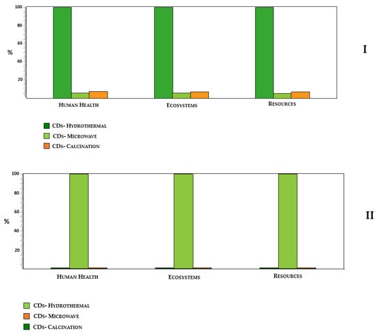 In this section, the three different synthesis routes were first evaluated individually to analyze their impact contributions in each category using a weight-based functional unit to produce 1 Kg of CDs. As in line with previous studies from our group [25,31], the use of CA accounts for most environmental impacts to all categories (Figures S5–S7). Urea is clearly the second highest contributor to the different categories for hydrothermal synthesis, especially for the Resources category (Figure S6). On the contrary, the environmental impacts of electricity consumption are relatively negligible for hydrothermal synthesis (Figure S6). The profile of environmental impacts for calcination and microwave synthesis is somewhat different (Figures S7 and S8). Namely, for these two synthesis routes, both urea and electricity consumption present more relevant contributions to the different categories, despite CA still being the highest one. Moreover, electricity is now the second highest contributor for the global categories of Human Health and Ecosystems (Figures S7 and S8), for both calcination and microwave synthesis. Water consumption presents negligible contributions for both hydrothermal and microwave synthesis, while being non-existent for the calcination route.