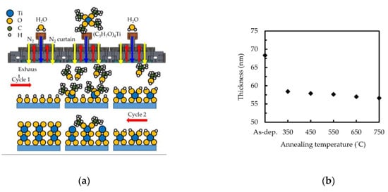 (a) Schematic diagram of the mechanism of sALD TiO2 deposition. (b) Thickness of the sALD TiO2 films before and after annealing at different temperatures.
