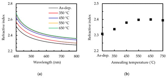 (a) Refractive index spectra and (b) refractive index at a 632 nm wavelength for the sALD films without and with various annealing temperatures.