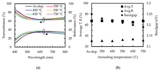 (a) Transmittance and reflectance of sALD TiO2 films with various annealing temperatures. (b) Average transmittance, average reflectance and band gap as a function of the annealing temperature.