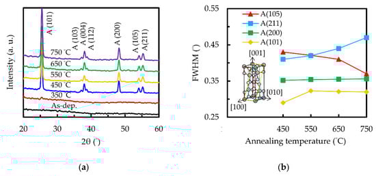 To confirm the crystalline structure, the X-ray diffraction patterns of the sALD TiO2 films with different annealing temperatures are shown in Figure 4a. The peaks at 2θ = 25.3°, 36.9°, 37.8°, 38.6°, 48.1°, 53.9°and 55.1° correspond to (101), (103), (004), (112), (200), (105) and (211) anatase phases (JCPSD card #83-2243). The sample before annealing did not have any observable peaks. This is in good agreement with other studies using thermal ALD, showing that deposition below 200 °C results in amorphous TiO2 [,,]. The film annealed at 350 °C seems to have a very weak peak at 25.3°, but it was difficult to distinguish from the background. The film structure changes from amorphous to polycrystalline anatase at 450 °C. When the annealing temperature increases to 750 °C, no other phases such as rutile (main peak at 2θ = 27°) are presented, indicating that the film maintains the polycrystalline anatase phase in a wide temperature range. The previously mentioned low band gap of the 750 °C-annealed sample is therefore not attributed to the formation of the rutile phase. Another possible reason for the low band gap is related to the sub-bandgap absorption caused by high temperature-generated defects, leading to localized states under the conduction band minimum and a shift of the absorption edge towards long wavelengths. Figure 4b shows the full width at half maximum (FWHM) of the diffraction peaks as a function of the annealing temperature. It can be seen that the FWHM of the (100) and (200) peaks do not change significantly. The FWHM of the (211) peak rises with an increasing annealing temperature, while the FWHM of the (105) peak decreases, implying that annealing temperature causes the (211) anatase phase to be gradually replaced by the (105) phase.