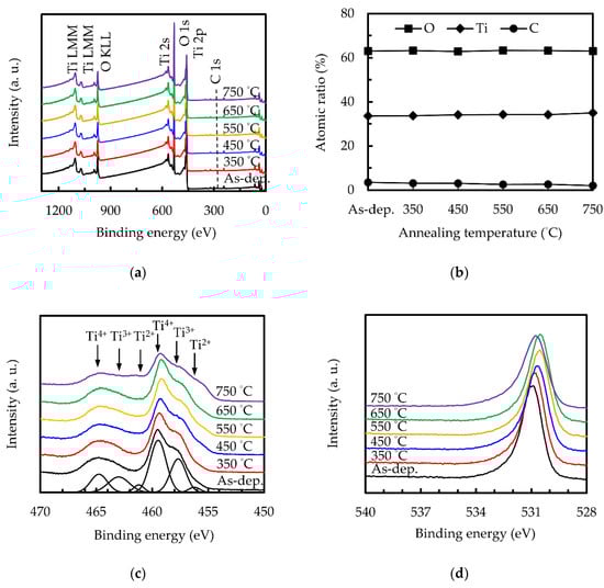 Figure 5a shows the XPS spectra of sALD TiO2 thin films at different annealing temperatures. The Ti, O and C atomic ratios obtained from the XPS spectra are shown in Figure 5b, showing that all the films are oxygen-deficient with O/Ti ratios ranging from 1.87 to 1.79. The C atomic ratio decreases with an increasing annealing temperature. Figure 5c shows a high resolution of the Ti 2p peaks. All subsequent analyses are only based on the Ti 2p3/2 spin-orbit coupling state, but both the 1/2 and 3/2 states are fitted because the split is only about 5.7 eV, which leads to the overlap of Ti3/24+ and Ti1/22+. Compared with the 3/2 state, the area ratio of the 1/2 state is 0.43 ± 0.03. One can see that Ti 2p3/2 has three different oxidation states, which correspond to Ti4+ of 459 ± 0.2 eV, Ti3+ of 457.2 ± 0.2 eV and Ti2+ of 455.9 ± 0.2 eV, respectively [,]. It can be seen that the samples with an annealing temperature below 650 °C have similar results and that the proportion of Ti4+ increases slightly with an increasing annealing temperature, reaching the maximum at 550 and 650 °C. However, when the annealing temperature further increases to 750 °C, the composition of Ti3+ and especially Ti2+ increases significantly. In the O 1s spectrum, as shown in Figure 5d, the main peak shifts from 531.33 eV toward a lower energy. In the literature, the binding energy of 531.33 eV is usually related to hydroxyl groups, carbonate-like substances or other carbon-related impurities, or to oxygen-deficient titanium dioxide (e.g., TiOx, where 1.35 < x < 1.65) []. The first two explanations may be reasonable on the surface in the as-deposited state because it may have hydroxyl or carbon impurities that are adsorbed from the air or that remain in the structure as residues of incompletely reacted ALD precursors. The shift of the peak towards 530.2 eV corresponding to O2− in TiO2 reveals the reduction of incompletely reacted ALD precursors and hence the densification after receiving the annealing treatment. The binding energy increases for the 750 °C-annealing can be explained by the increase in oxygen vacancies, arising from the desorption of oxygen.