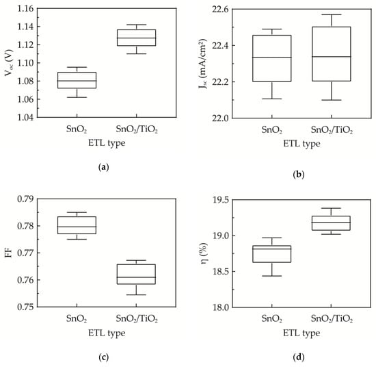 where kT/q is the thermal voltage, Isc is the short-circuit current and I0 is the leakage current. Therefore, the hole-electron recombination at the FTO/ETL interface reduces the Voc. The sALD TiO2 used as a compact layer leads to enhanced hole blocking, a reduced leakage current and eventually an improved Voc, even at such a small thickness. The Jsc is not much influenced as shown in Figure 7b due to the similar refractive indices of TiO2 and SnO2, and the very thin TiO2 thickness. The amount of incident light is not much affected by the insertion of the sALD TiO2 layer. The slight decrease in FF as shown in Figure 7c could be explained by the increase in series resistance caused by the addition of the sALD TiO2 layer, and therefore it is important to keep the thickness of TiO2 as thin as possible. Overall, the conversion efficiency is significantly improved due to the Voc enhancement (Figure 7d). In the literature, most of the solution-based single-layer or double-layer ETLs give a Voc of 1.05–1.11 V [,,,], while the plasma-enhanced ALD or thermal ALD ETLs generally show a Voc of 1.09–1.11 V [,,]. The sALD SnO2/TiO2 ETL in this study leads to an improved Voc. Furthermore, while the sALD and traditional vacuum-type ALDs have insignificantly different GPC values (~0.7 Å/cycle), it costs 3 s for one sALD cycle and at least 60 s in the case of the plasma or thermal ALD. For an 8-nm thickness of TiO2, sALD needs about 6 min to finish the deposition, whereas other ALDs require about 70 min. In this study, a high deposition rate sALD is used for preparing the very thin TiO2 compact layer. Although it is noted that the crystallinity of the 8-nm sALD TiO2 may not behave exactly as the 60-nm layer previously used for film characterization, the thin TiO2 compact layer leads to an improved Voc and conversion efficiency. The sALD is thus more advantageous in the application of perovskite solar cells.