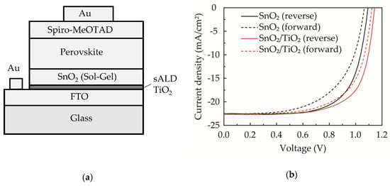 (a) Schematic of the structure of the perovskite solar cells. (b) J-V curves of perovskite solar cells without and with an 8-nm-thick sALD TiO2 compact layer.