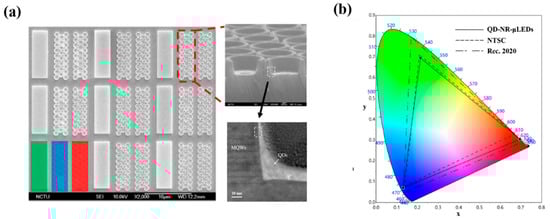 (a) Scanning electron microscopy (SEM) image of red, green, and blue (RGB) pixel array and NR-μLED with 30° tilt angle; transmission electron microscopy (TEM) image of the contact area between multi quantum wells (MQWs) and QDs. (b) Color gamut of RGB hybrid QD-NR-μLEDs, NTSC, and Rec. 2020 [46]. Figure reproduced with permission from Optical Society of America.