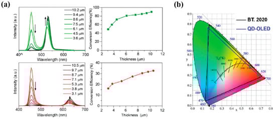 (a) Photoluminescence (PL) spectra and light conversion efficiency (LCE) of green and red QD layers at different thicknesses. (b) Color gamut of the QD-OLED display (blue triangle area), in comparison with the color gamut of BT. 2020 (black triangle area) [47]. Figure reproduced with permission from Royal Society of Chemistry.