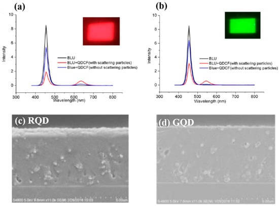 Comparison of (a) red and (b) green QDCFs spectra with and without scattering particles under blue LED backlight. (c,d) The cross-sectional SEM images of red and green QDPR on glass through photolithography process [48]. Figure reproduced with permission from John Wiley and Sons.