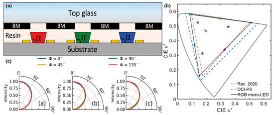 To minimize this particular color shift, Gou et al. introduced a device layout and studied the angular color shift of RGB μLED displays from a mismatched angular distribution suggesting a simulation model to support the experimental findings [53]. The author found that the green and blue chip sidewall emissions are far larger than those of red chips due to better absorption in red MQWs. The light emission from the red chip decreases because of the Lambert’s cosine law, while that of green and blue μLEDs increases and subsequently decreases. The difference in material dynamics of RGB chips will cause an angular shift in mixed colors. Owing to the low-cavity effect within μLEDs, no color change is observed at a fixed driving current for primary colors. The color shift problem is exacerbated as the size of the μLEDs decreases because of increased sidewall emissions from green and blue chips. To mitigate the color change, green and blue μLED sidewall emissions must be removed, and the RGB radiation patterns, i.e., the Lambertian distribution, must be obtained. Hence, Gou et al. suggested a system mode shown in Figure 7a, where the system consists of a μLED array and top black matrix outside the emission region. Further, the space between the μLEDs is filled with resin with a refractive index of about 1.5, such that the sidewall emissions from green and blue chips are completely absorbed by the black matrix, resulting in emissions from the top of RGB μLEDs with matched Lambertian distributions only. Moreover, the author introduces a taper angle, α, shown in Figure 7a, to boost the light intensity from the top emission. The light intensity from the green and blue chips is observed to increase as α increases from 90° to 140°, upon which it saturates, with little influence on the red chip. The color shift is extreme when α is larger than 130°, and the wider taper angle contributes to a narrower angular distribution between green and blue emissions, with no effect on the red channel, thus inducing a severe color shift. Figure 7b illustrates the simulated color shifts of ten reference colors at viewing angles from 0° to 80° for the RGB μLED display with top black matrix and 120° taper angle. The average color shift at 80° is 0.05, and the maximum value for the magenta channel is 0.014, which is below 0.02, and thus it is acceptable for commercial applications. The simulated radiation patterns for RGB μLEDs with the top black matrix clearly illustrate that the sidewall emission completely disappears owing to the presence of the black matrix, and the color shift is significantly reduced with a matched angular distribution for both RGB colors, as shown in Figure 7c. Therefore, with a high light extraction output, this device structure is believed to significantly suppress the color shift.