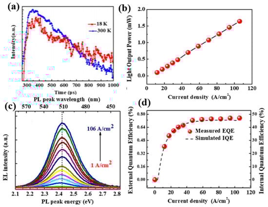 Figure 10a represents the TRPL measurement showing the mono-exponential decay spectrum of the capped QDs at 300K and 18K. The lifetime is achieved at 480 ps at 300 and the radiative lifetime at 18 K is 707 ps indicating that non-radiative recombination at low temperature is fully suppressed. Since the radiative lifetime is inversely proportional to the overlap of electron and hole wave functions, this shorter lifetime is a solid indication of built-in fields reduction. The light output power (LOP) of the device is shown in Figure 10b showing a linear increase with respect to the injected current density up to 106 A/cm2. To investigate the built-in field in the QDs, the electroluminescence (EL) spectra of the LED is measured for different injection currents at room temperature which are shown in Figure 10c. It is apparent that there is no shift of EL peak wavelength as the injection current is gradually increased from 1 A/cm2 to 106 A/cm2 suggesting a fully screened built-in fields and yet green QD LEDs with no observed efficiency drop have not yet been identified. Figure 10d depicts the external quantum efficiency (EQE) of the LED as a function of the injection current density and it is very clear that the efficiency without droop up to an injection current density of 106 A/cm2 is due to fully screened built-in field thereby inducing an increase in the rate of radiative recombination. The Auger recombination coefficient is calculated from the theoretical simulation of IQE as shown in the figure and found to have a very low value which indicates that it does not contribute to the efficiency droop. Hence, there is strong evidence that InGaN QDs can substantially enhance LED performance and solve efficiency droop problems with fully screened built-in fields.
