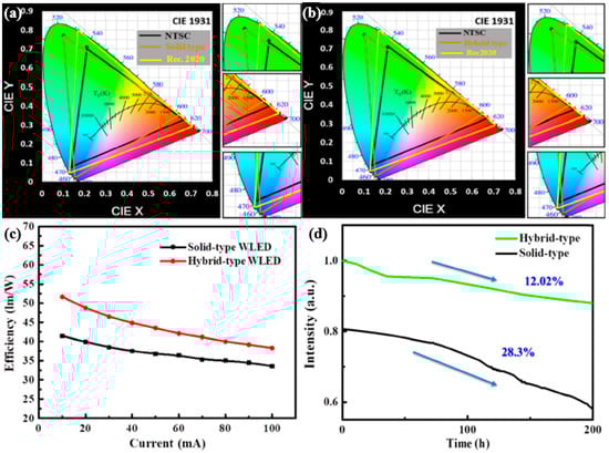Color gamut on CIE 1931 color space for (a) solid and (b) hybrid-type WLED. (c) Luminance efficiency with respect to current. (d) Stability of solid- and hybrid-type WLEDs [74]. Figure reproduced with permission from Optical Society of America.