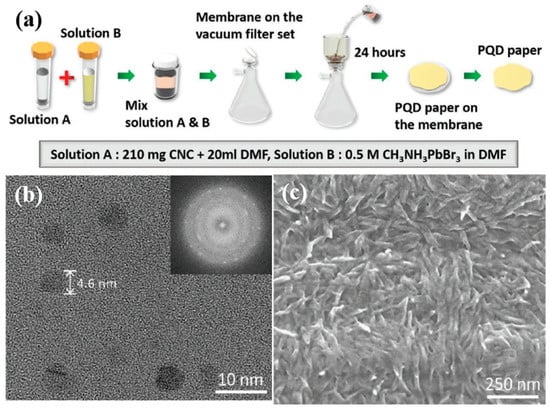 In another research for PQDs-based, Kang et al. demonstrated white light emitting diodes (WLEDs) using PQD paper exhibiting an ultrahigh luminous intensity, wide color gamut, and long operational lifetime [78]. The aim of this research was to establish a cost-effective and scalable production technique to resolve high-energy radiation by demonstrating a paper manufacturing process using cellulose nanocrystals (CNCs) to manufacture a new form of PQD film. Figure 13a illustrates the manufacturing process of PQD paper. The CNC suspension and CH3NH3PbBr3 are combined in dimethylformamide, upon which the mixture is dried on the membrane to produce the PQDs paper. In comparison to other approaches, this technique is fast, convenient, and consumes less time to aid in the rapid development of PQD paper. The inclusion of cellulose nanocrystals (CNC) enables the orderly arrangement of the crystal structure, thus creating mechanical strength in the paper and allowing the capping ligands to encapsulate the growth of the QD structures by reprecipitation, thereby contributing to strong fluorescence emission. However, the use of CNC degrades the quantum yield of the PQDs, as the CNCs absorb light in the ultraviolet region. From the TEM and SEM images shown in Figure 13b,c, it is evident that the size of the PQDs lies within the range of 3–8 nm, which facilitates a powerful quantum confinement effect. This confinement effect plays a major role in enhancing the light emitting efficiency of the perovskite.