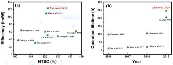 Comparison of device performance between PQD paper-based LED and other reported LEDs using QDs as color converters. (a) Luminous efficiency and color gamut performance and (b) operational durability of reported QD-based LEDs [78]. Figure reproduced with permission from John Wiley and Sons.