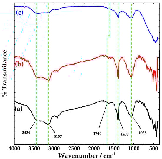 Figure 1 shows the FTIR spectra of: (a) pristine carbon nanotubes (pCNTs), (b) functionalized CNTs (fCNTs) and (c) zirconia doped carbon nanotubes (ZrO2-fCNTs) nanostructured system. FTIR spectra shows similar spectra for CNT and fCNTs samples, this can be attributed to the weak charge difference between the carbon atoms due to the high symmetry of CNTs which generates weak signals in the infrared spectrum [29]. Furthermore, the pristine, functionalized and ZrO2 doped CNTs show vibration bands at 1400 cm−1, attributed to vibration modes of multi-walled carbon nanotubes (MWCNTs) [30], and a very weak band at 1740 cm−1 assigned to C=O vibration of the carboxylic groups, present from the purification and functionalization treatments. Titration experiments to measure the concentration of functional groups on the CNTs walls resulted in 3 × 10−3 mol·g−1. The broad band around 4300 cm−1 and the band at 1630 cm−1 correspond to hydroxyl groups. The binding of ZrO2 on the MWCNT sidewalls surface is associated to the small shift observed in the C=O band of the carboxylic group (Figure 1c). Moreover, it has been reported that carbon groups stabilize the growth of zirconia nanoparticles on the fCNTs surface [31]. The C=C, C–H and C–O–C vibration bands are in the region of 1200 to 1550 cm−1 inherent to CNTs structure. Figure 2 presents the fingerprint region of CNTs (a) and fCNTs (b) in a range of 400 to 1800 cm−1. Figure 2c shows a broad band between 400–750 cm−1 corresponding to ZrO2 vibration modes with a broad maximum at 480 cm−1 assigned to Zr–O–Zr asymmetric stretching and deformation modes [32].