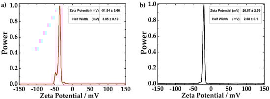The zeta potential technique was used to understand the electrostatic interactions in the hybrid CNTs dispersions. An electrical field is applied across the suspensions which vary the movement of the particles [35]. The mobility of particles gives information of the charge present. Furthermore, the colloidal stability is controlled by the electrostatic interactions of the particles and the solvent [36]. The zeta potential spectrum of fCNTs is shown in Figure 5a. The mean value of zeta potential is −51.84 mV with a standard deviation of 9.66 mV. The negative charge of fCNTs is due to the deprotonation of functional groups (carboxylic and hydroxyl groups) which were attached to the CNTs walls during the acidic treatment. Figure 5b shows the zeta potential measurement of the ZrO2-fCNTs sample with a mean value of −26.87 mV and a standard deviation of 2.69 mV. The ZrO2 nanoparticles are attached to the functional groups, which neutralize part of the fCNTs charge, then the zeta potential of ZrO2-fCNTs is lower than for fCNTs. Clogston and Patri [35], reported that the nanoparticles with zeta potential values between ±10 mV are considered neutral while the values greater than +30 mV or less than −30 mV are considered strongly cationic or anionic, respectively. Therefore, the solutions of fCNTs, and ZrO2-fCNTs can be considered strongly anionic and moderated anionic, respectively. The charge of the CNTs plays an important role in the colloidal stability and the dispersion of CNTs on the electrode surface. As the charge of CNTs are anionic, the solvent of both samples will be the same. DMF was the solvent selected to suspend both CNTs samples. Both suspensions, fCNTs and ZrO2-fCNTs, presented high stability.