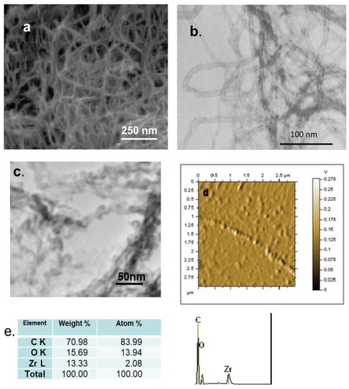 SEM, TEM and AFM analysis of the different materials are shown in Figure 7. FESEM image of ZrO2-fCNTs sample is shown in Figure 7a, zirconia nanoparticles can be observed decorating the carbon nanotubes. The EDS analysis showed the presence of zirconium, oxygen and carbon (Figure 7e). TEM images show the characteristic morphology of fCNTs with an average diameter 12 ± 2 nm (Figure 7b), the ZrO2-fCNTs image can be observed in Figure 7c, showing the rounded zirconia nanoparticles with a random distribution on the fCNTs walls. Table 5 shows that the diameter of CNTs has decreased after functionalization due to some degradation of nanotube’s walls during the acid treatment process. The particle size of zirconia nanoparticles is 6.6 ± 1.8 nm in good agreement with the size obtained by XRD. Figure 7d is the AFM image in amplitude mode of carbon nanotube decorated with zirconia nanoparticles.