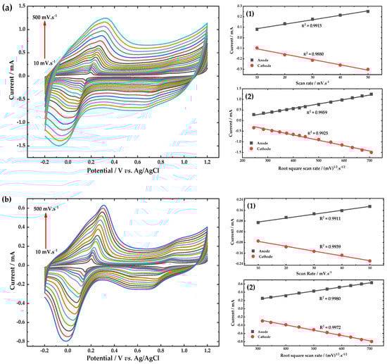 Cyclic voltammograms response of the (a) PB/fCNTs/GC and (b) PB/ZrO2-fCNTs/GC modified electrodes, in a 0.1 mol·L−1 PBS (pH 6.8) solution, at scan rates between 10–500 mV·s−1. Inset (1) current vs. scan rate, and inset (2) current vs. (scan rate)1/2.