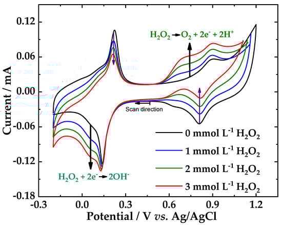 On conventional electrodes, peroxide reactions require high overvoltage, either reduction or oxidation, reactions 3 and 4 [55]. The challenge in the literature is to produce chemically modified electrodes, at which the overvoltage, both the electrochemical H2O2 oxidation and reduction reaction can be reduced so that measurements can be performed at oxidation potentials less than +1.0 V and reduction potentials below −0.1 V (vs. SCE) [54], respectively. According to our previous results [47], the PB/fCNTs/GC electrode exhibited an unstable behavior at the potentials applied for detection H2O2. Therefore, the PB/ZrO2-fCNT/GC modified electrode was considered the best electrode for the evaluation H2O2 detection in terms of operability. Figure 10 shows cyclic voltammograms of hydrogen peroxide at PB/ZrO2-fCNTs/GC electrode, where well-defined redox peaks were obtained. In the presence of H2O2, both zones of the voltammogram showed a marked decrease in the reverse redox currents and both zones showed an increase in the forward redox currents, demonstrating that the electrocatalytic reduction and oxidation of hydrogen H2O2 occurred in both zones. The redox peaks at +0.6 V presented an electrocatalysis towards the oxidation of H2O2 (reactions 4), while the redox peaks at +0.2 V electrocatalyzed the H2O2 reduction (reactions 3). PB/ZrO2-fCNTs/GC electrode shows a decrease in the over-voltages to reduce or oxidize peroxide. Figure 10 also demonstrates that at PB/ZrO2-fCNTs/GC electrode the electroxidation of hydrogen peroxide is more effective, due to the better response of the modified electrode to increased peroxide concentration. In addition, the anodic peak current increased by ca. 25 and 10% and the cathodic peak decreased by ca. 20 and 30%, clearly indicating a catalytic oxidation reaction.
