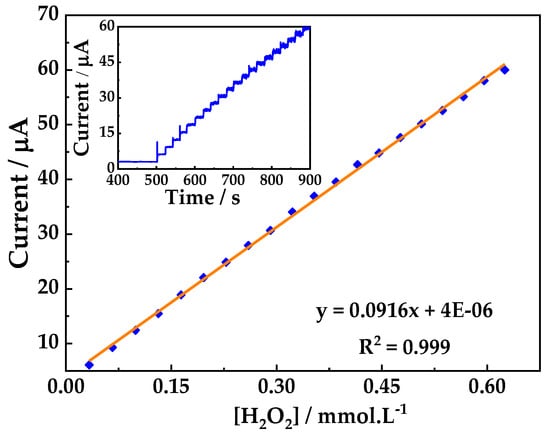 Chronoamperometric detection of H2O2 at the PB/ZrO2-fCNTs/GC electrode, in a 0.1 mol·L−1 PBS (pH 6.8) solution and its calibration curve. Working potential of 1.0 V vs. Ag/AgCl.