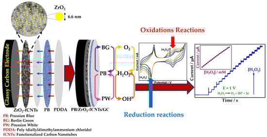 Prussian blue (PB) is part of an important group of inorganic compounds used in electrode modification and for electrocatalytic purposes [10,11]. PB is known as an artificial peroxidase [12,13], and it is a promising candidate for the catalysis of H2O2. The use of PB as a recognition element for H2O2 detection is extensive [14,15,16]. Furthermore, in order to increase the sensitivity and the rapid response of electrochemical sensors, nanomaterials and nanostructured systems are used to modify the electrode surface, since it has been reported that nanomaterials promote electron transfer more efficiently between the electrodes [6,7,8,11,17,18,19]. On the other hand, carbon nanotubes possess interesting chemical and physical properties, which are useful in order to modify electrochemical sensors, therefore, the combination of PB, carbon nanotubes (CNTs), and metals have received special attention. Carbon nanotubes have good electrical conductivity; therefore, they can be used as a mediator for PB-modified electrodes. Electrochemical sensors for H2O2 detection are developed by adding electroactive materials (metals, metal oxides, enzymes, etc.) on the surface of electrodes. Hydrogen peroxide is a mediator found in the majority of biological reactions. You et al. [20] reported the electrocatalytic reduction of H2O2 using a system of Pd on CNTs. The electrode showed good linear range detection attributed to the improved sensitivity and selectivity. Wang, et al. [21] reported the determination of H2O2 on an electrode based on PB and CNTs. On the other hand, the use of zirconia nanoparticles involves applications such as: oxygen sensors, solid oxide fuel cells, H2 gas storage materials, catalysts and catalyst support, biosensors [22]. Nanostructured zirconia has been used as a biosensing platform for oral cancer detection using cyclic voltammetry techniques [23]. Additionally, zirconia nanoparticles grafted to collagen were used as an unmediated biosensing of H2O2, accelerating the electron transfer with good thermal stability [24]. Zirconia/multi-walled carbon nanotube nanocomposite was used to immobilize myoglobin showing excellent electrocatalytic activity to the H2O2 reduction [25]. In addition, zirconia/reduced graphene has been used as a high performance electrochemical sensing and biosensing platform [26], obtaining glucose oxidase immobilization successfully.