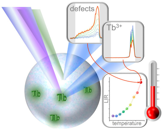 In the nanocrystalline lanthanide oxides, broad bands from surface oxygen defects have been noted. They were investigated in e.g., Y2O3 doped with Eu3+ [25] or Tb3+ [26], in which the defect emission intensity was comparable to that of dopant ions in a certain temperature range. The influence of temperature on the emission of defects has been demonstrated, which led us to the conclusion that such structures could be intentionally used in optical thermometry. Usually, the emission of such structures is quenched with temperature, however, for energy mismatches of excitation radiation, it is possible to note an increase in the intensity of defect emission, which is associated with satellite phonons [25]. In this work, we show for the first time the exploitation of emission of oxygen defects, occurring in rare earth oxides, in excitation-ratiometric approach to luminescence thermometry using Tb3+ ions emission as the luminescent reference. It has been shown that the Tb3+ emission band obtained upon UV excitation decreases at elevated temperatures. On the other hand, the defect emission upon green excitation reveals thermal enhancement. The opposite monotonicity of these two signals integrated in the same spectral range enables the development of single band ratiometric (SBR) luminescent thermometers based on intrinsic defect emission (Figure 1).