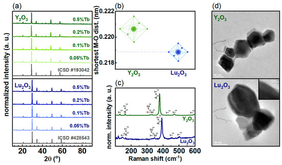 Figure 2. (a) X-ray diffraction patterns of the nanocrystalline rare earth (RE) oxides doped with different concentrations of the Tb3+ ions; (b) Shortest metal–oxygen distances in the given crystals; (c) Raman shift; (d) Transmission Electron Microscopy images of the nanocrystalline RE oxides doped with 0.5% Tb3+ ions (the appropriate scale bar is presented in each image).