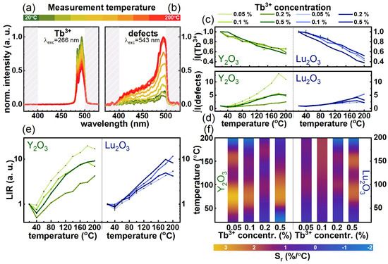 where ΔLIR represents the change of LIR corresponding to ΔT change of temperature. The maps presenting the thermal dependence of Sr for different dopant concentration shown in Figure 4g indicate that in the case of Y2O3:Tb3+ nanocrystals, there is no correlation between dopant concentration and the Sr. The highest Sr values were found in the 60–100 °C temperature range, for which with the maximum Sr = 4.92%/°C at 40 °C for Y2O3:0.05%Tb3+. On the other hand, in the case of Lu2O3:Tb3+ nanocrystals, the increase of dopant concentration leads to the gradual enhancement of the Sr value. This effect may result from the difference in the ionic radii of Lu3+ and Tb3+. The increase of the dopant ion concentration of larger ionic radii with respect to the substituted one results in the generation of the larger number of defect states. The analogous difference in the ionic radii in the case of Y2O3:Tb3+ nanocrystals is only slight.