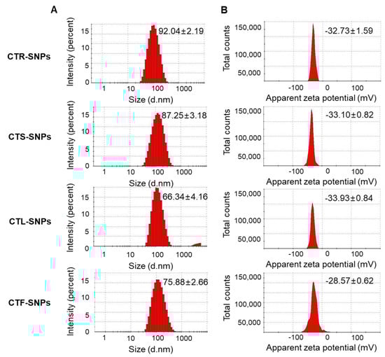 (A) DLS showing size distribution and (B) zeta potential of CTR, CTS, CTL, and CTF-SNPs.