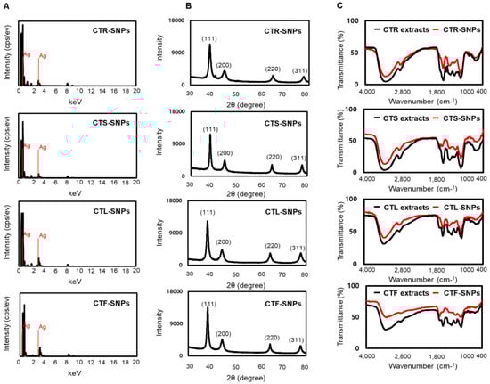 To examine the well-crystallized silver pattern of the CTR-, CTS-, CTL-, and CTF-SNPs, EDS analysis was performed (Figure 4A). The EDS analysis revealed the surface chemical composition of SNPs and the results showed two clear Ag signals pertaining to the elements in CTR-, CTS-, CTL-, and CTF-SNPs. The surface plasmon resonance analysis showed that CTR-, CTS-, CTL-, and CTF-SNPs displayed peaks at 0.24–0.27 keV, and 2.96–2.98 keV, respectively, due to the presence of Ag. The XRD pattern of CTR-, CTS-, CTL-, and CTF-SNPs shows four intense peaks at four 2θ values (30–80°) of 38.12–38.39°, 44.37–44.50°, 64.70–64.89°, and 77.80–77.96°, respectively (Figure 4B). The peaks of the XRD plots seemed to broaden, confirming that the highly purified SNPs are composed of crystalline silver. The peaks at 38.12–38.39°, 44.37–44.50°, 64.70–64.89°, and 77.80–77.96° can be assigned to the typical (111), (200), (220), and (311) planes of the face-centered cubic crystal structure of Ag (JCPDS NO. 65-2871), respectively. No other peaks for any contaminations were detected. This is in line with the FFT pattern and EDS analysis results. The “green” nanotechnologies of SNPs involve medicinal plants, which act as functionalizing ligands under physiological conditions, creating SNPs that are highly appropriate for biological applications. These studies in FT-IR was analyzed to investigate the presence of bioactive components in CTR-, CTS-, CTL-, and CTF-SNPs. The CT extracts also provide possible functional groups, which attach to the surface of the CT-SNPs, resulting in capping and efficient stabilization. In our study, the FT-IR spectra was examined to obtain further evidence about the presence of bioactive components in the CTR-, CTS-, CTL-, and CTF-SNPs such as the capping layer. The FTIR spectra of CTR, CTS, CTL, and CTF extracts and corresponding CTR-, CTS-, CTL-, and CTF-SNPs designated extensive resemblance between the extracts and the SNPs. Furthermore, the prominent peaks of CTR, CTS, CTL, and CTF extracts and their corresponding SNPs are characterized by –OH stretching of alcohols and phenols at 3237.02 cm−1, 3238.97 cm−1, 3243.28 cm−1, and 3259.53 cm−1, respectively. –CH stretching of amines was also observed at 2968.89 cm−1, 2936.75 cm−1, 2896.68 cm−1, and 2836.98 cm−1, respectively. N–H or C=C bond of phenols or carbonyl groups were also observed at 1635.65 cm−1, 1628.42 cm−1, 1639.36 cm−1, and 1634.68 cm−1 (Figure 4C), respectively. These functional groups on CTR-, CTS-, CTL-, and CTF-SNPs show that CTR-, CTS-, CTL-, and CTF-SNPs are stabilized by high –OH stretching or N–H bond possessing bioactive components probably derived from phenols []. Based on these results, we suggested that the reduction, capsulation, and stabilization of CTR-, CTS-, CTL-, and CTF-SNPs was owing to functional groups present in the CT extracts, such as phenolics, flavones, terpenoids, alkaloids, polysaccharides, proteins, and alcoholic compounds.