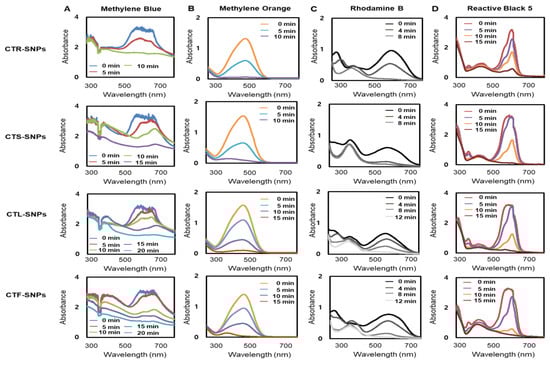 UV-visible spectrum of (A) MB, (B) MO, (C) RB, and (D) RB5 on addition of CTR, CTS, CTL, and CTF-SNPs.