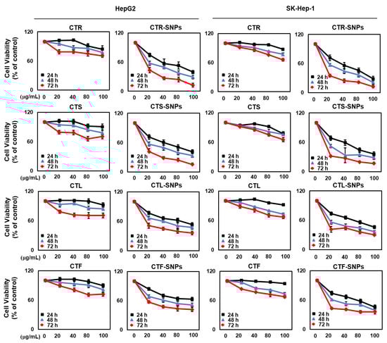 Human hepatocellular carcinoma cell lines (HepG2, SK-Hep-1) were purchased from American Type Culture Collection (ATCC, Manassas, VA, USA). They were cultured with Minimum Essential Medium Eagle (MEM) media (Gibco; Thermo Fisher Scientific, Inc., Waltham, MA, USA) containing 10% FBS (Gibco; Thermo Fisher Scientific, Inc., Waltham, MA, USA), 1% Penicillin/Streptomycin (Gibco; Thermo Fisher Scientific, Inc., Waltham, MA, USA) at 37 °C with 5% CO2. Cell viability assay was performed using CCK-8 (Sigma, Saint Louis, MO, USA) solution according to the manufacturer’s instructions. Cells were cultured in 24-well plates at a density of 1 × 104 cells per well for 24 h. Cells were treated with various concentrations (0–100 μg/mL) of CT extracts and CT-SNPs and incubated at 37 °C with 5% CO2 for 24 h, 48 h, and 72 h. Afterward, the CCK-8 solution was treated to the medium at 37 °C with 5% CO2 for 4 h. The optical density was read at a wavelength of 450 nm with the FLUOstar Omega Plate Reader (BMG Labtech).