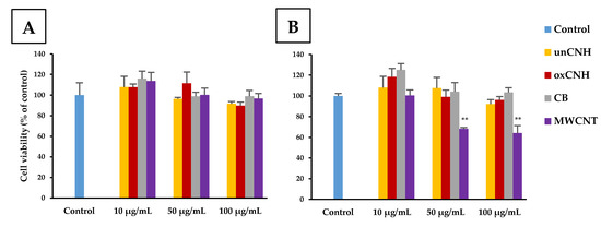 Cell viability of HLEC exposed to varieties of carbon nanomaterials. (A) The cell viability was measured for 24 h. (B) The cell viability was measured for 48 h. Data are expressed as the mean ± S.E. (n = 4). ** p < 0.01. HLEC, human lymphatic endothelial cell; unCNH, untreated carbon nanohorn; oxCNH, oxidized carbon nanohorn; CB, carbon black; MWCNT, multi-walled carbon nanotube.