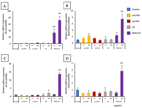The expression of six inflammatory cytokines (IL-1β, IL-6, MCP-1, RANTES, IL-8 and TNF) was measured after exposure to each CNM at 10 and 100 µg/mL. Four inflammatory cytokines showed a significant change in gene expression compared to the control group (Figure 3). Exposure to 100 µg/mL MWCNT significantly increased expression of IL-6, RANTES, IL-8, and TNF compared to the control group. In particular, gene expression of IL-6 was increased approximately 72-fold and IL-8 expression was increased approximately 14-fold compared to the control group. Moreover, IL-6 and RANTES also showed a significant increase in gene expression in cells exposed to 10 µg/mL MWCNT. The unCNH and oxCNH groups did not show any significant changes compared with control or concentration-dependent trends.