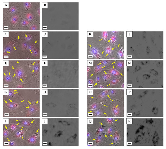 Live HLEC images after incubation with H33342 for nuclear staining and CytoPainter LysosomalStaining Kit for lysosomes. (A,B) Control, (C,D,K,L) unCNH, (E,F,M,N) oxCNH, (G,H,O,P) CB, (I,J,Q,R) MWCNT. (A,C,E,G,I,K,M,O,Q) Image obtained by merging the phase contrast image and the fluorescence images. (B,D,F,H,J,L,N,P,R) Bright field image. (C–J) 10 µg/mL. (K–R) 100 µg/mL. Scale bars correspond to 20 μm. Yellow arrows indicate CNMs. HLEC, human lymphatic endothelial cell; H33342, bisbenzimide H33342 fluorochrome trihydrochloride; unCNH, untreated carbon nanohorn; oxCNH, oxidized carbon nanohorn; CB, carbon black; MWCNT, multi-walled carbon nanotube; CNMs, carbon nanomaterials.