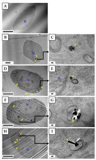 TEM images of HLECs exposed to CNMs at 10 μg/mL. (A) Control, (B,C) unCNH, (D,E) oxCNH, (F,G) CB, (H,I) MWCNT. (A,B,D,F,H) Low magnification. Scale bars correspond to 10 μm. (C,E,G,I) High magnification. Scale bars correspond to 100 nm. Yellow arrows indicate CNMs. TEM, transmission electron microscope; HLEC, human lymphatic endothelial cell; CNMs, carbon nanomaterials; unCNH, untreated carbon nanohorn; oxCNH, oxidized carbon nanohorn; CB, carbon black; MWCNT, multi-walled carbon nanotube; N, nucleus.
