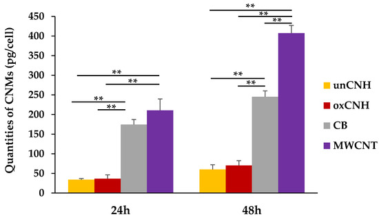 Uptake of each CNM per cell. HLECs were exposed to 50 μg/mL CNMs for 24 h and 48 h. Mean ± S.E. (n = 4), ** p < 0.01. CNM, carbon nanomaterial; HLEC, human lymphatic endothelial cell; unCNH, untreated carbon nanohorn; oxCNH, oxidized carbon nanohorn; CB, carbon black; MWCNT, multi-walled carbon nanotube.