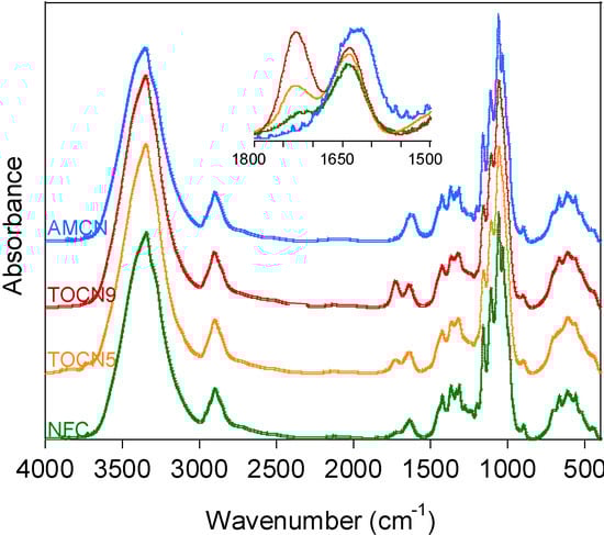 FT-IR spectra in absorbance of the unmodified nanofibrillated cellulose (NFC), TEMPO-oxidized NFC (TOCN5 and TOCN9) and amine-modified NFC (AMCN). The inset shows the 1800–1500 cm−1 region.