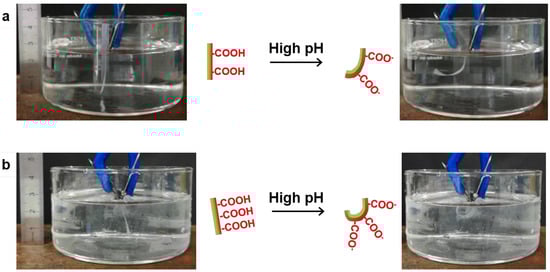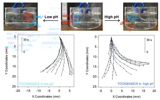 Next, in order to increase the pH range of these NFC actuators, bilayer films containing TOCN9/AMCN were prepared. Depending on the pH, the resulting nanopapers contained negatively charged groups on one side (COO−), at high pH, and positively charged groups on the opposite side (NH3+), at low pH, so that the pH tuned the bending direction. Figure 7 shows the bending behavior when nanopapers were immersed in aqueous solutions either at pH 13 (NaOH 0.1 M) or at pH 1 (HCl 0.1 M). At high pH, carboxyl groups became deprotonated, which provided negative charge, whereas the amino groups were neutral. Therefore, while the TOCN9 layer was significantly swollen, the AMCN layer remained unchanged, causing asymmetric expansion and subsequent bending. In contrast, at low pH (pH 1), the carboxyl groups remained uncharged whereas the amino groups were positively charged thanks to their protonation. Therefore, the AMCN layer was swollen, and bending occurred in the opposite direction.