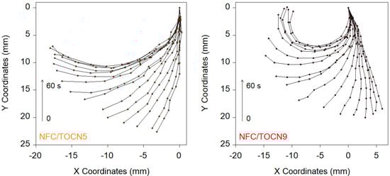 The curvature of the bilayer nanopapers was evaluated from the measurement of the X-Y coordinates of the samples during the bending process. Figure 3 shows the X-Y coordinates of the films at different times during bending for the NFC/TOCN5 and NFC/TOCN9 nanopapers.
