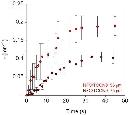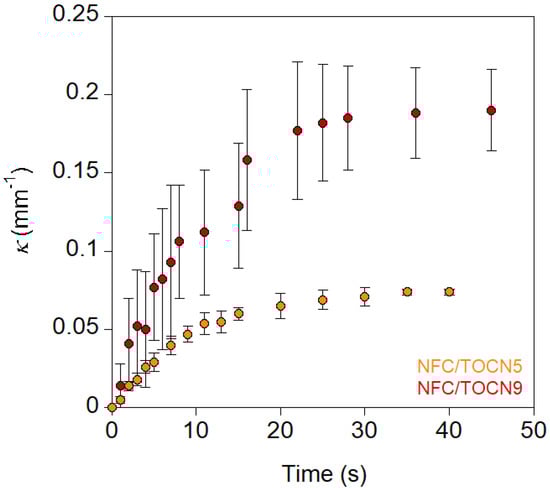Wang et al. demonstrated that bending curvature became reduced when the film thickness increased [8]. To quantitatively verify the impact of thickness (d), NFC/TOCN9 nanopapers were prepared by adjusting the amounts of NFC and TOCN9 to obtain a thicker film containing a dried mass of 85.2 ± 1.6 mg and displaying a thickness of 75 ± 1 µm. In comparison, the previously described nanopapers had a dried mass of 59.6 ± 4.3 mg and a thickness of 53 ± 2 µm. The bending of thick nanopapers is shown in Figure S3. Figure 5 shows the evolution of curvature as a function of time for the NFC/TOCN9 nanopapers, with different thicknesses immersed in NaOH 0.1 M (pH 13).