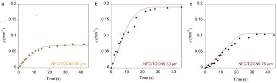 Curvature as a function of time of (a) NFC/TOCN5 (50 µm), (b) NFC/TOCN9 (50 µm), and (c) NFC/TOCN9 (75 µm) nanopapers when they were immersed in high pH aqueous solutions (pH 13). The circles correspond to experimental data and the solid lines represent the fit.