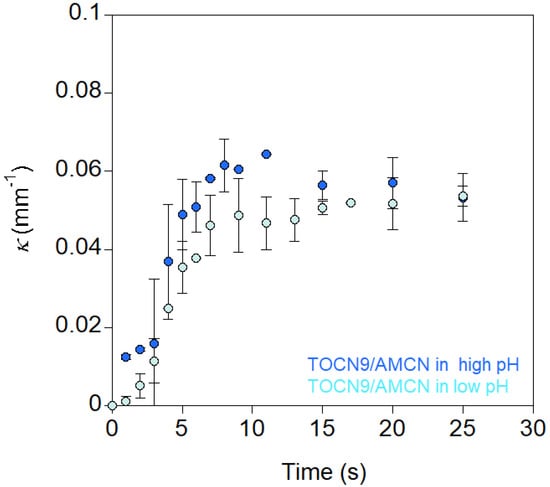 When TOCN9/AMCN nanopapers were firstly immersed in water, some random films bent as if the TOCN9 layer became more swollen than the AMCN layer (some films bent and some films remained straight). Duan et al. [28] prepared bilayer hydrogel actuators containing chitosan (NH2) and cellulose/carboxymethylcellulose (COOH) layers cross-linked by epichlorohydrin. They observed that the films were in a straight state at pH 3.8. Above this pH, the cellulose/carboxymethylcellulose layer exhibited higher swelling because of the deprotonation of some carboxylic acid groups, resulting in expanding the cellulosic layer. Therefore, the bending observed after the immersion of TOCN9/AMCN nanopapers in water could be ascribed to the partial deprotonation of carboxylic acid groups from the TOCN9 layer in water. Thus, for monitoring the actuation of the TOCN9/AMCN nanopapers, they were directly immersed in acidic or alkaline aqueous solutions. The changes in curvature upon time are shown in Figure 8. The plots of curvature versus time show a sigmoidal behavior for the TOCN9/AMCN films, indicating a slow increase in curvature at the beginning of bending followed by a steep increase before reaching the maximal curvature. The low increase in κ observed between 0 and 3 s could be due to water uptake when nanopapers were immersed for the first time in the aqueous solutions at either high or low pH. Then, the curvature increased rapidly, corresponding to the formation of charged groups and the subsequent asymmetric swelling. Despite the different nature and concentration of charges, the absolute curvature reached similar values in both acidic and alkaline pHs (Figure 8), which indicated comparable bending deformation of both TOCN9 and AMCN layers.