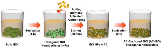 First, NiO nanoparticles (1.5 g) were dissolved in DI water (80 mL) through the continual stirring step for 15 min. Subsequently, we mixed biomass-AC nanosponges (0.5 g) into the NiO-dissolved solution by stirring for 20 min. Thereafter, the mixture solution was sonicated under high ultrasonic power of 240 W for 2 h at 35 kHz. Finally, the sonicated solution was cleaned, sieved, and dried at 150 °C for 5 h. These processes allowed us to successfully synthesize the AC-NiO nanotablets.