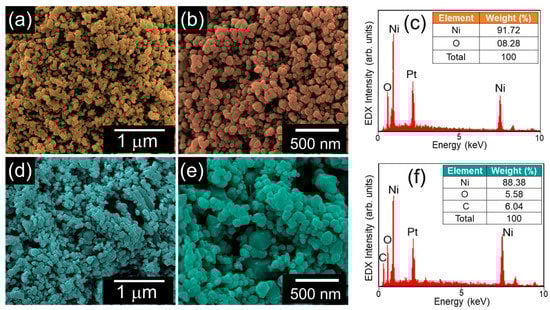 Figure 2 shows the microstructural and the compositional properties of the NiO nanoparticles and the AC-NiO nanocomposites. From Figure 2a,b one can confirm that the hexagonal NiO nanoparticles are densely packed and interconnected with each other. The NiO nanoparticles contain only their own intrinsic species of Ni and O, except for Pt from conductive-coating for FE-SEM measurements (Figure 2c). For the AC-NiO nanocomposites, the aggregated structures of the nanotablets were visible (Figure 2d,e). In addition, the EDX spectrum confirmed that the AC-NiO nanocomposites obviously involved the C species (Figure 2f). This signifies that the NiO nanoparticles were well-anchored with the AC nanosponges. In order to help understanding the formation kinetics of the AC-NiO nanocomposites via the solvent-free green routes, we here interpret the reaction mechanism of the water-assisted sonication method. For the sonochemical reaction in aqueous solution, water (H2O) generates two primary radicals of hydrogen (H*) and hydroxyl (OH*). Those radicals act as the reductants during sonication of bulk materials [48,49,50,51,52]; hence, bulk NiO (nNiO) could be reduced into small NiO nanoparticles (NiO(n)) under the high ultrasonic power in H2O. Such a sonochemical reduction can be expressed as follows: