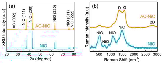 (a) XRD patterns and (b) Raman spectra of the NiO nanoparticles and the AC-NiO nanotablets.